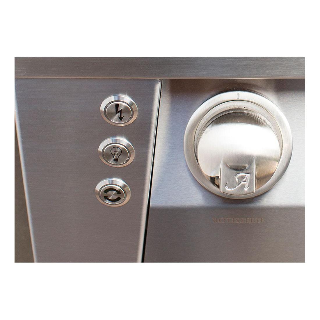 Alfresco brings restaurant-inspired luxury and professional grilling results to your outdoor kitchen with the ALXE grill in Signal Gray. This 42-inch refrigerated cart model gas grill has three (3) titanium and stainless steel blend burners that produce 27,500 BTUs each, for a total of 82,500 BTUs of total cooking power on the grilling surface. The integrated rotisserie system has a 18,500 BTU rear ceramic infrared burner and a whisper-silent motor with a chain-driven spit that has 120 pounds of turning torque. The rotisserie spit rod can be conveniently stored under the bullnose of the drip tray when not in use. Grill also features a 5,000 BTU smoker system with a stainless steel burner that ejects smoke at 200 degrees onto your grill and a smoker drawer that is large enough to hold peppers, herbs, and wood chunks and is sealed to hold liquids as well. Unique pyramid-shaped ceramic briquettes eliminate hot spots and maximize flavor as they evenly deliver heat to the cooking surface. An air-cooled front control panel keeps your knobs and control panel cool while grilling, protecting both the equipment and your hands from high heat. The 600 degree heat-resistant silicone sleeves protect the electrical wires of the grill. This propane gas grill has a spacious 770 square inches of actual grilling area, double-lined hood for durability, a removable 3-position warming rack, and heavy-duty rolled stainless steel cooking grids capable of providing perfect steakhouse results. This Alfresco grill is also equipped with a refrigerated cart that features all-welded commercial stainless steel construction, 4 cubic ft door section, dual drawers with removable stainless steel food pans and a compact, commercial compressor system. ALXE model grills also feature rich amber LED front panel lights, stainless steel push button ignition, lighting and rotisserie controls, a new torsion spring-assisted hood system, and nickel-plated, ergonomically-designed knobs and bezels. This all-American made grill has a grill cover included.
