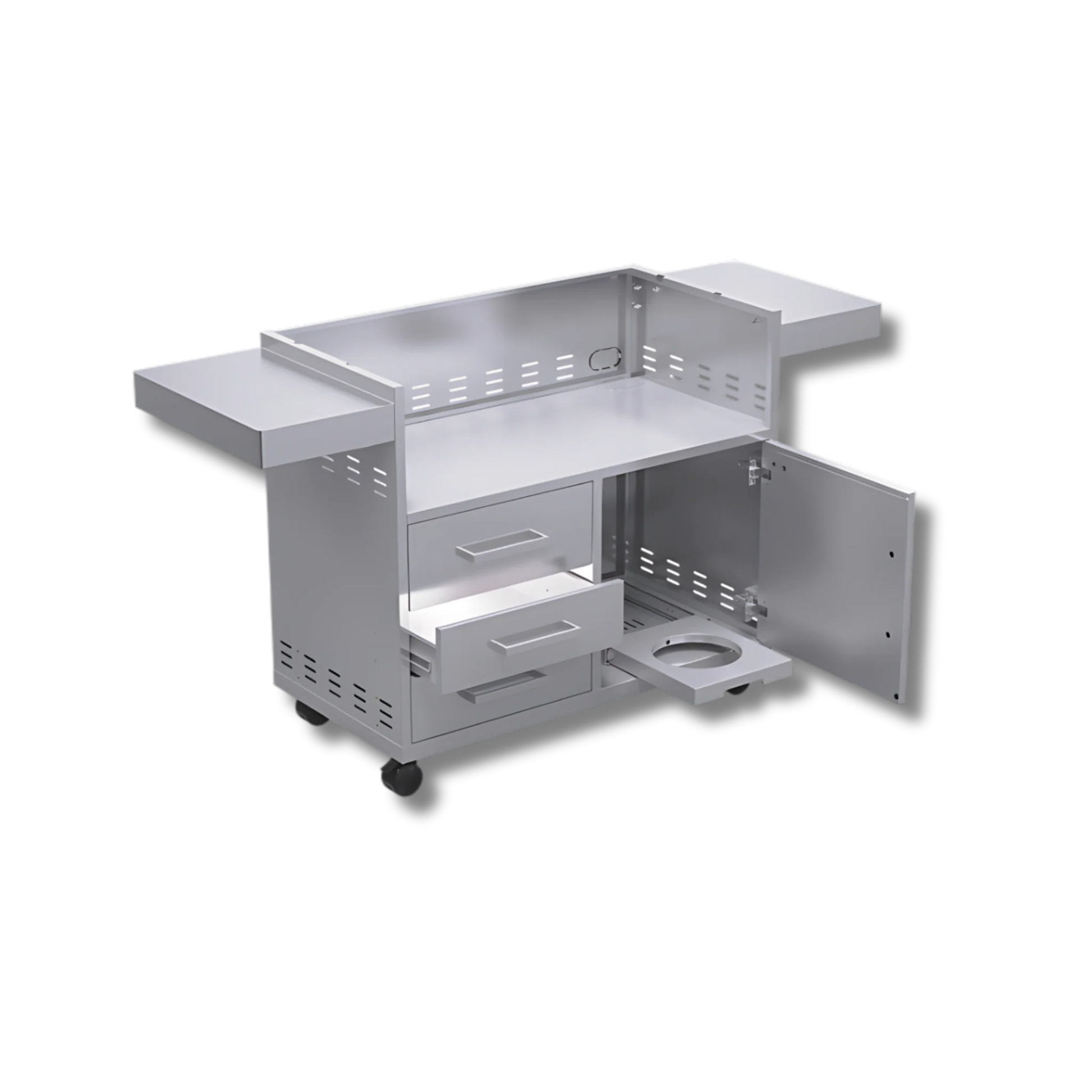 Featuring two spacious drawers, a built-in paper towel holder, and a dedicated propane tank cabinet, this cart delivers superior organization and convenience. Its wide, durable frame offers a stable grilling platform and generous workspace, making it an essential foundation for high-performance grilling.