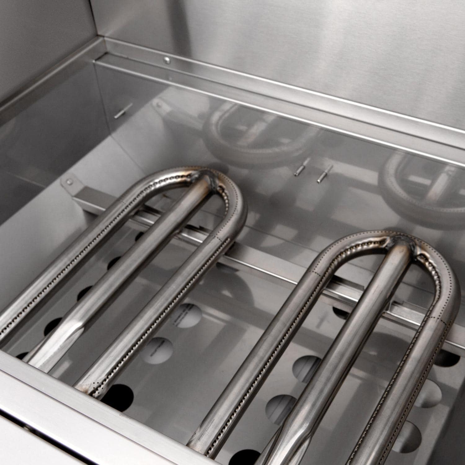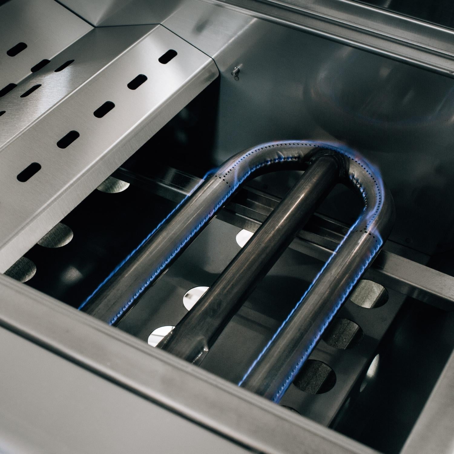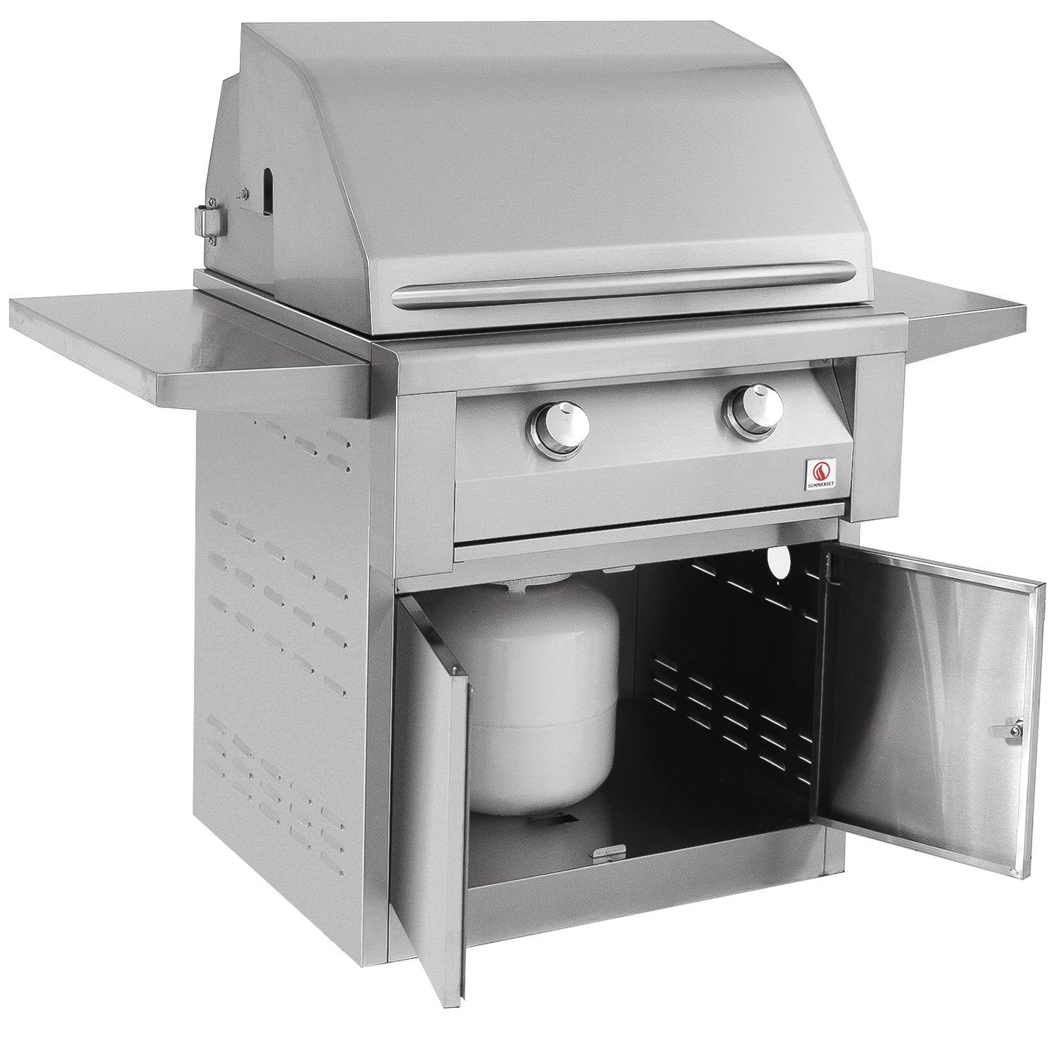 The Builder grill is a sleek, rugged gas grill designed for commercial or hospitality applications. Constructed entirely with 304 grade stainless steel, the Builder is designed to excel in heavy-use environments such as apartment, hotel or country clubs. This 30-inch freestanding gas grill is powered by two 26,000 BTU, 304 grade stainless steel U-shaped burners that push a total of 52,000 BTUs. The cooking space measures 541 square inches, and the grates are built from 9mm stainless steel rods. The SBG32-LP s also equipped with heavy-duty anti-theft knobs, locking cart doors and a double insulated hood. Ignition is safe and convenient, thanks to a flame-thrower style ignition that also includes a manual flash tube backup. Unit ships as natural gas ready with orifices for propane conversion included. Conversion must be done by a licensed professional.
