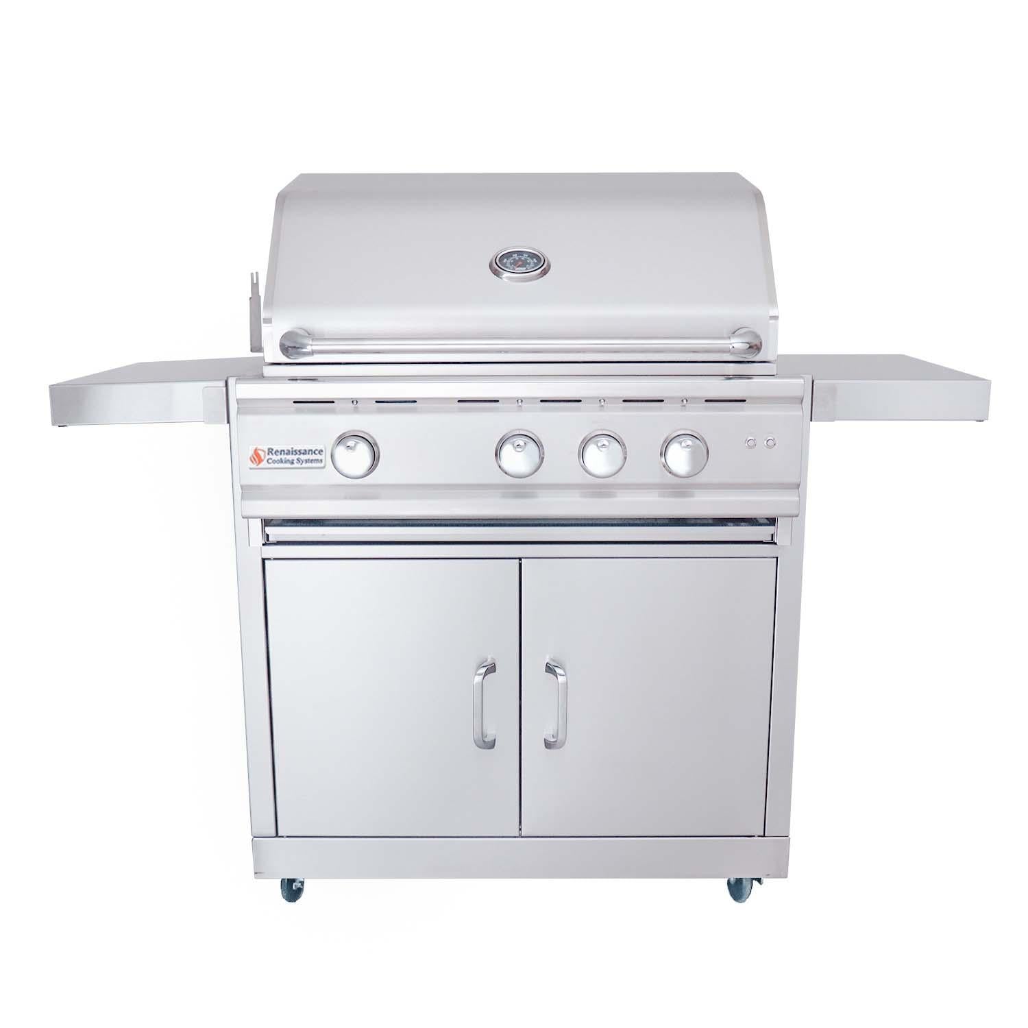 The RCS Cutlass Pro 30 Inch Propane Grill is designed for the weekend cook as well as the professional chef. With cast stainless steel burners, solid stainless steel rod cooking grids and warming rack, plus the 304 stainless steel housing, these grills will provide you with many years of great tasting food. Other quality features include the rear infrared rotisserie burner with motor, spit rod with two 4 prong forks, heat zone separators, interior halogen lights, LED illuminated control knobs and a full width slide out drip tray. Also included is a sure strike ignition system, which is the most reliable in the industry. Optional infrared searing burner upgrade is available! These grills are gorgeously sophisticated, yet very simple to operate. On a stainless steel freestanding cart. Includes hose & regulator for 20lb tank(tank not included).