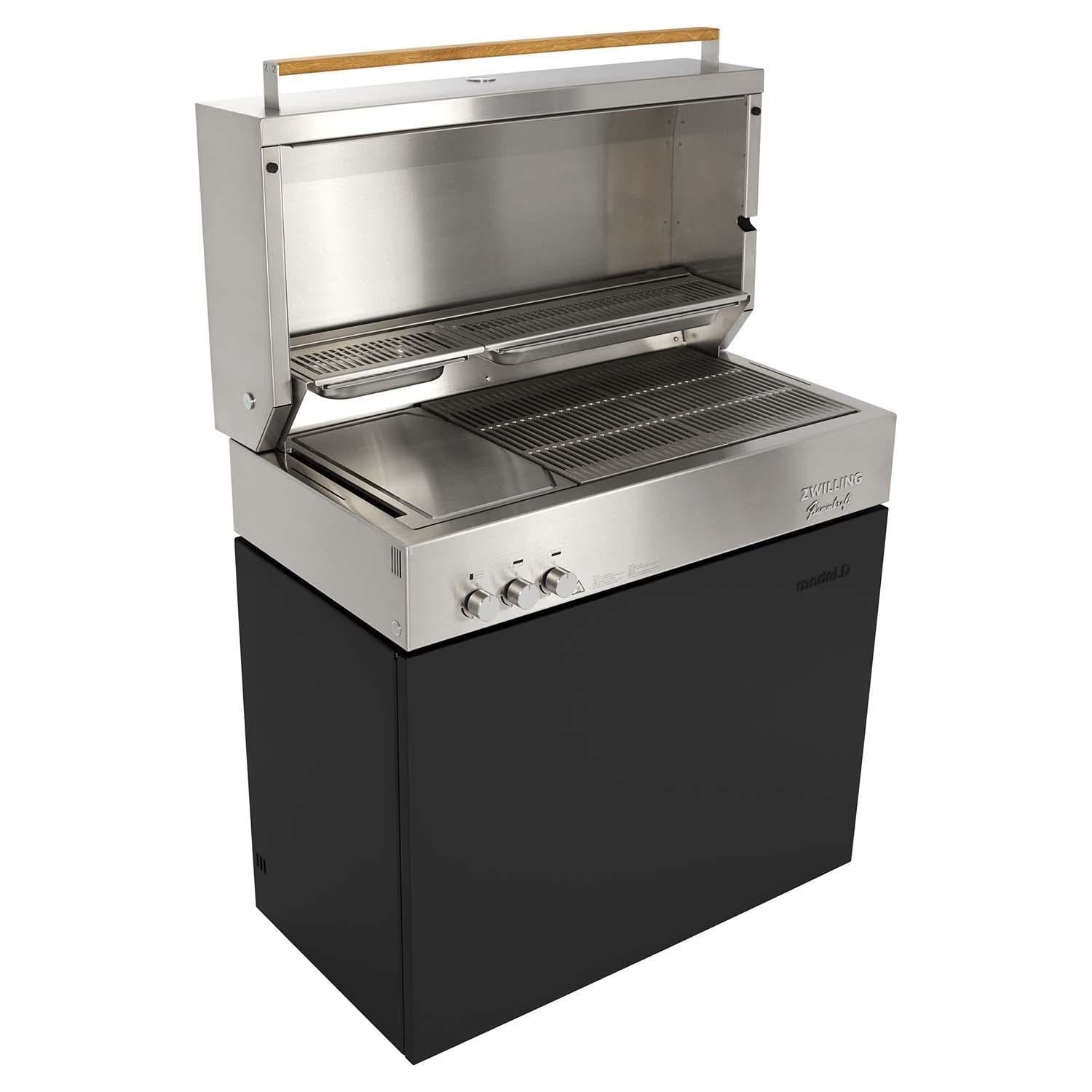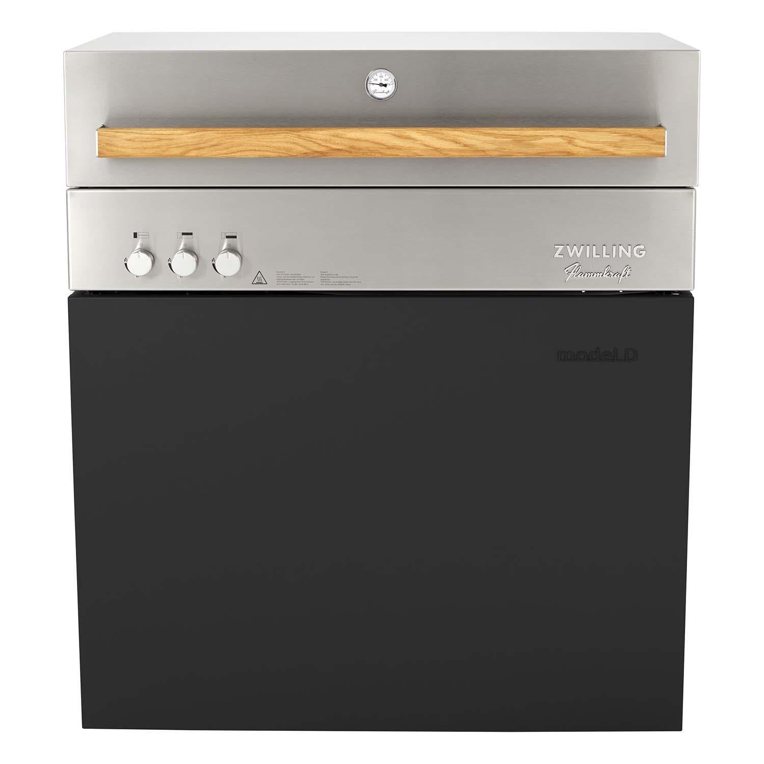 Transform the way you cook and discover countless cooking possibilities with the ZWILLING Flammkraft Model D Grill in Ivory Black, featuring innovative infrared technology. An award winning design, versatile infrared burners that create individual cooking and heating zones, high quality stainless steel and expert German engineering will set a new standard for outdoor kitchens and cooking ; Discover the Model D difference. Constructed entirely of high quality stainless steel and crafted in Germany, the Model D is versatile, powerful and the perfect ingredient for any outdoor kitchen, featuring faster and hotter grill temperatures between 167 and up to 1652 degrees Fahrenheit. Form meets function. Created with convenience in mind, the Model D features a substantial, yet sophisticated design that looks good and works even harder, featuring smart storage solutions, with built in features to maximize space and an integrated wind deflector. And while the Model D stands alone, its also built in compatible for any outdoor kitchen. Get in the zone. The pioneering placement and arrangement of burners creates individual cooking and heating zones so you can grill, roast and more with direct and indirect heat (think convection oven too). The large, multipurpose surface also allows you to cook different foods at varying temperatures. And the integrated, all purpose oven trays are perfect for baking up sumptuous sides, veggies and more. Enjoy endless possibilities and meals. Make the most of your ZWILLING Flammkraft outdoor cooking experience with grilling accessories specially designed to complement the grill area. Prepare thin strips of Wagyu beef, tender scallops and crunchy vegetables on the Teppanyaki plate, whip up doughy delights with the pizza stone, saute stir frys in the wok or cook up chicken on the rotisserie skewer. Open and shut. Designed so that you can cook with the hood open or shut, the hood of the Model D is substantial, and features a double wall for complete insulation which ensures it heats up quickly and keeps an even temperature. Easy to clean. The Model D is easy to clean and maintain, with a convenient drawer for draining grease. Grates and burners can be removed and inserted quickly for easy cleanup and there s also an integrated waste bin compartment. Every Model D comes with a storage box that can also be used to soak and clean the grill parts. Color your (outdoor) world. The Model D is available in 7 timeless shades.