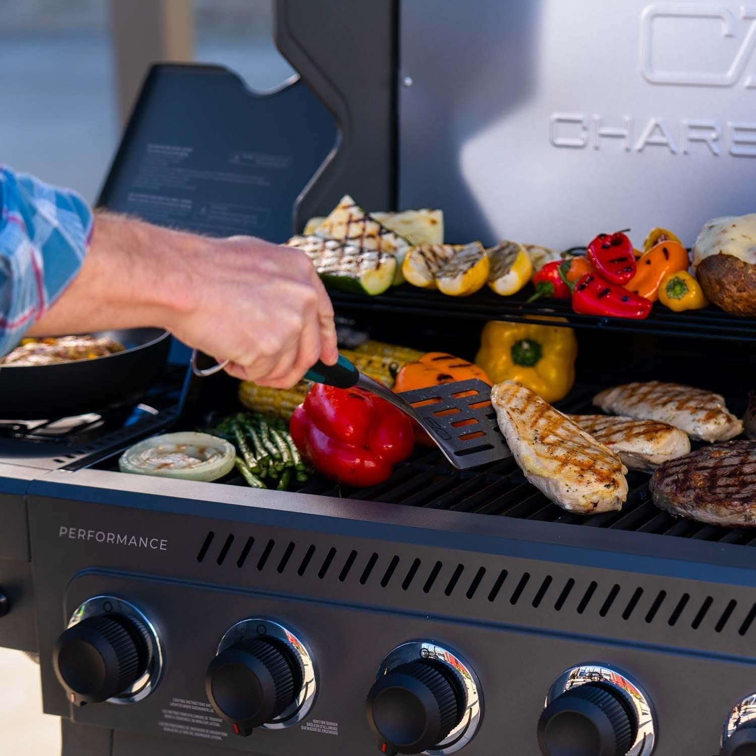 Get a little bit of this, and a whole lotta that with a Charbroil Performance Series grill in grey & stainless. This sleek 5-burner gas grill with a side burner is designed for grillers who want to cook a variety of mouthwatering, outdoor dishes for their crew. The advanced FlavorMax cooking system produces more consistent results, stress-free cooking, and juicier foods - and thanks to the mess-free grease management design, it means you'll be grilling more, cleaning up less. From burgers to chicken breasts to flank steak, this grill does a little bit of everything.