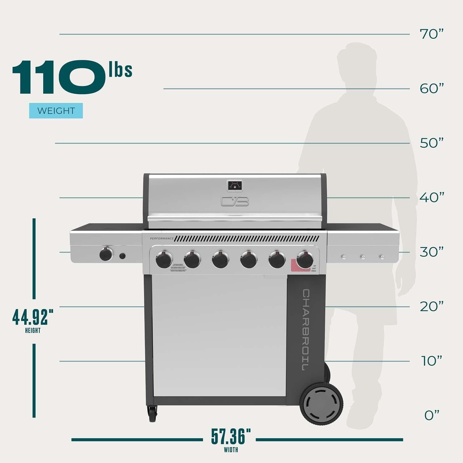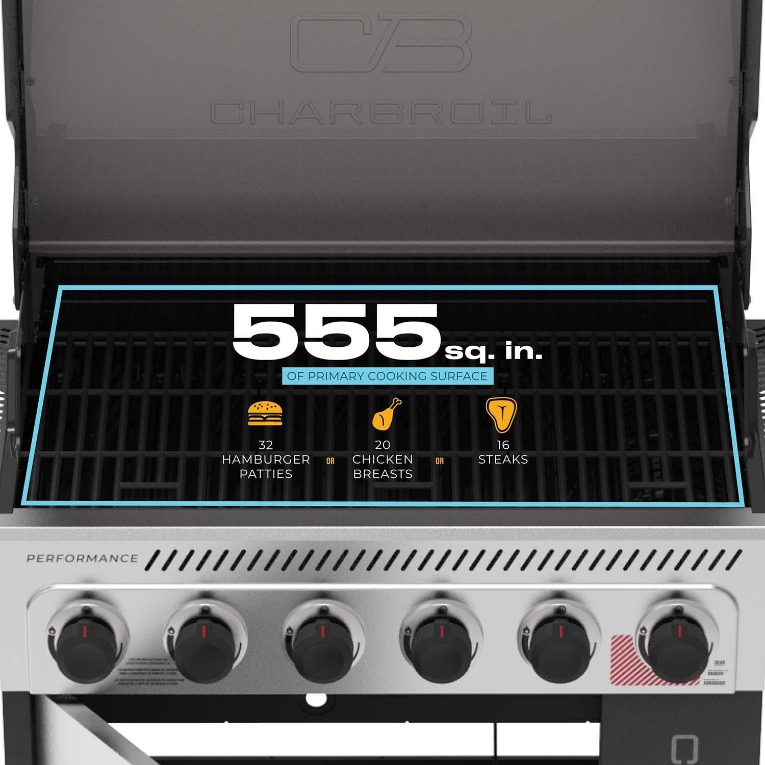 Get a little bit of this, and a whole lotta that with a Charbroil Performance Series grill. This sleek 6-burner gas grill with a griddle and a side burner is designed for grillers who want to cook a variety of mouthwatering, outdoor dishes for their crew. The advanced FlavorMax cooking system produces more consistent results, stress-free cooking, and juicier foods - and thanks to the mess-free grease management design, it means you'll be grilling more, cleaning up less. From burgers to chicken breasts to flank steak, this grill does a little bit of everything.