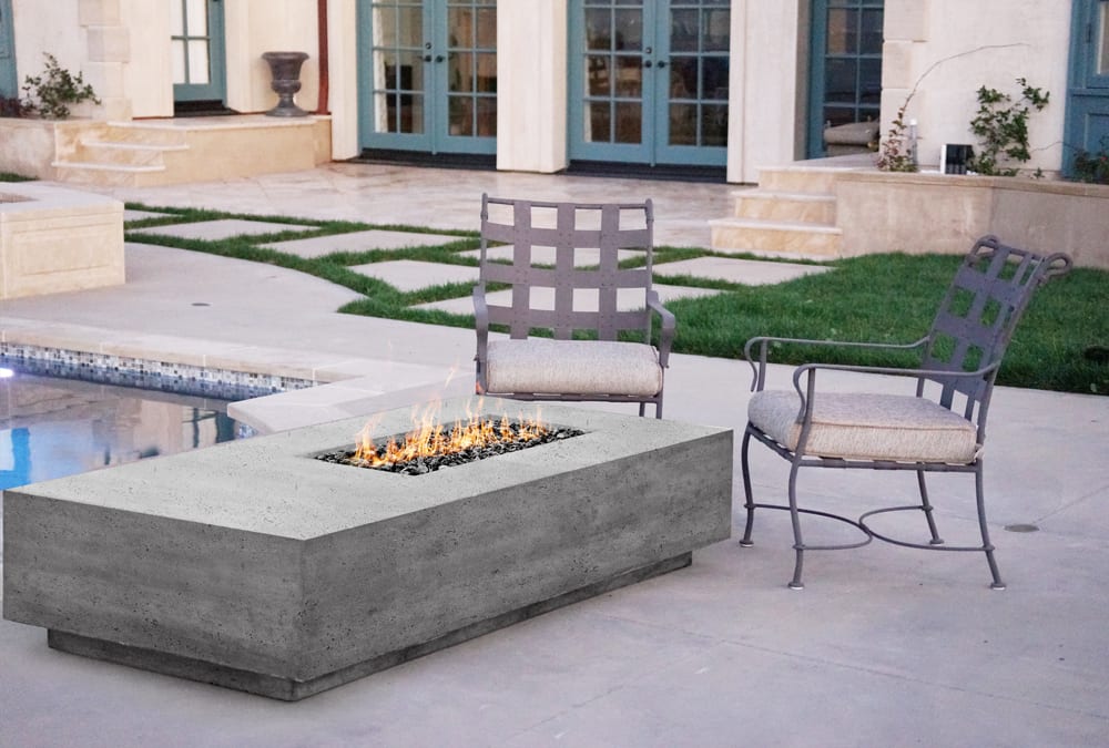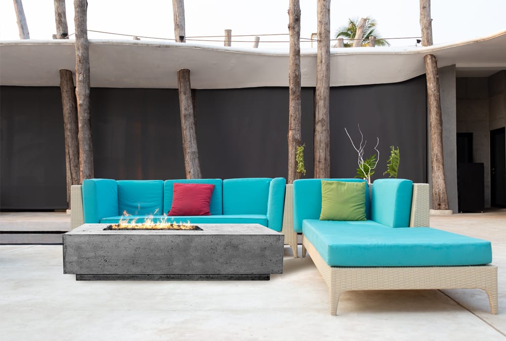 The asymmetrical Tavola 5 fire table provides an outdoor retreat of warmth and ambience.