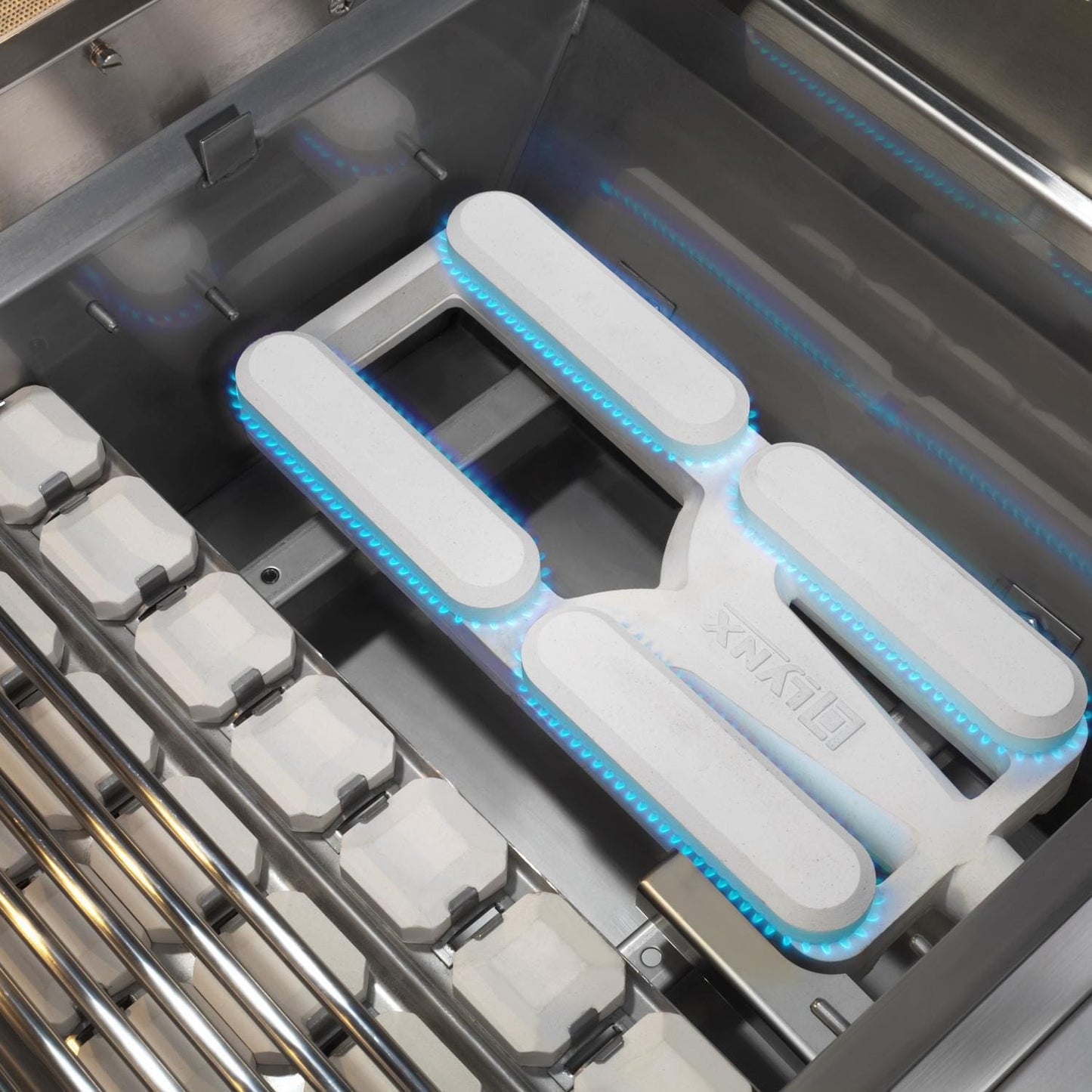 Experience the finest in outdoor grilling performance with the superior craftsmanship and innovative features found in this 36-inch natural gas BBQ grill from Lynx. The quality begins outside with gleaming, high-grade 304 stainless steel that is seamlessly welded to eliminate areas where grease and moisture can collect. A patented design deflects wind and allows the grill to vent properly, stabilizing critical surface temperatures when cooking in windy conditions. Inside, a 23,000 BTU Lynx Trident adjustable infrared burner allows you to sear thick-cuts perfectly or lower the temperature to cook more delicate items. Two 25,000 BTU ceramic burners deliver superior heat retention and delivery and will never rust or corrode. The three burners push 73,000 BTUs of total cooking power on the grilling surface. An advanced ignition system uses a hot element positioned directly above the burner port for reliably safe start-up and a large capacity smoker box allows you to add extraordinary flavor to all the things you like to grill. Over the burner, an array of fixed position ceramic briquettes ensures precise, even heat distribution to the 640 square inch main cooking grid while a secondary grid provides an additional 295 square inches for a comprehensive 935 square inches of overall grilling space. The Lynx L36TR-NG also has a dual-position internal rotisserie with heavy-duty, 3-speed motor and rear infrared burner to raise your cooking options to their full potential. Lynx made sure you have easy access to all these fine cooking features by adding lift assist and a handle that rotates fluidly as you raise and lower the hood. Like to grill into the night? The adjustment knobs on the control panel sport blue LED accent lights for precise control and ultra-bright internal halogen lights illuminate the grilling surface eliminating guess-work. Proudly made in the USA. Bring the power and performance of Lynx innovation to your outdoor kitchen with the L36TR-NG Built-in Natural Gas Grill.