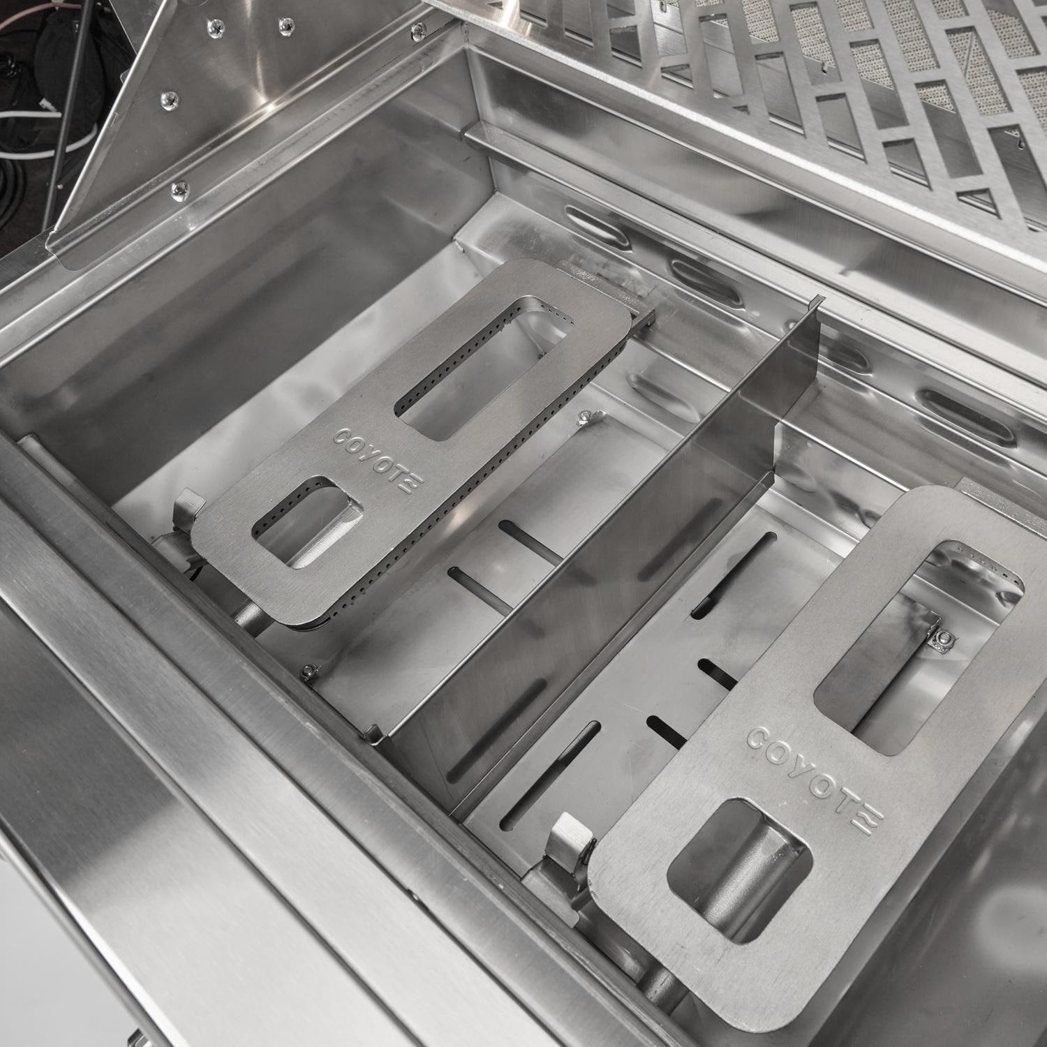 The Coyote SL-Series 30 inch freestanding propane grill offers innovative safety features & top of the line performance. Built from premium 304 stainless steel, this grill is packed with premium features including a spring-assisted hood, interactive lighting, & warming rack. The Coyote logo throw light not only makes a statement but illuminates your grilling area for the ultimate nighttime grilling experience. The double walled hood provides excellent insulation, helping to retain heat more effectively. The integrated wind guard ensures consistent heat and performance, so you can keep grilling even in windy conditions. The newly updated design also includes sleek knob and bezel styling, an improved end cap, and a sturdy handle for a refined look. Unique volcanic stone briquettes work in tandem with the two powerful Infinity burners to provide excellent heat retention & consistent heat across the laser-cut grates. The interchangeable sear burner, rear burner, & rotisserie kit offer additional versatility, giving you the flexibility to create a variety of dishes. The stainless-steel grill cart features self closing doors and drawer hinges, lockable casters, and a slide out shelf for propane tank storage. Designed for optimal safety & reliability, the innovative safety valve & thermocouple system allows gas to flow only when a flame is present. If the flame goes out, the thermocouple automatically shuts off the gas, preventing any potential hazards. Grill with peace of mind and enjoy outdoor cooking in your backyard for years to come.